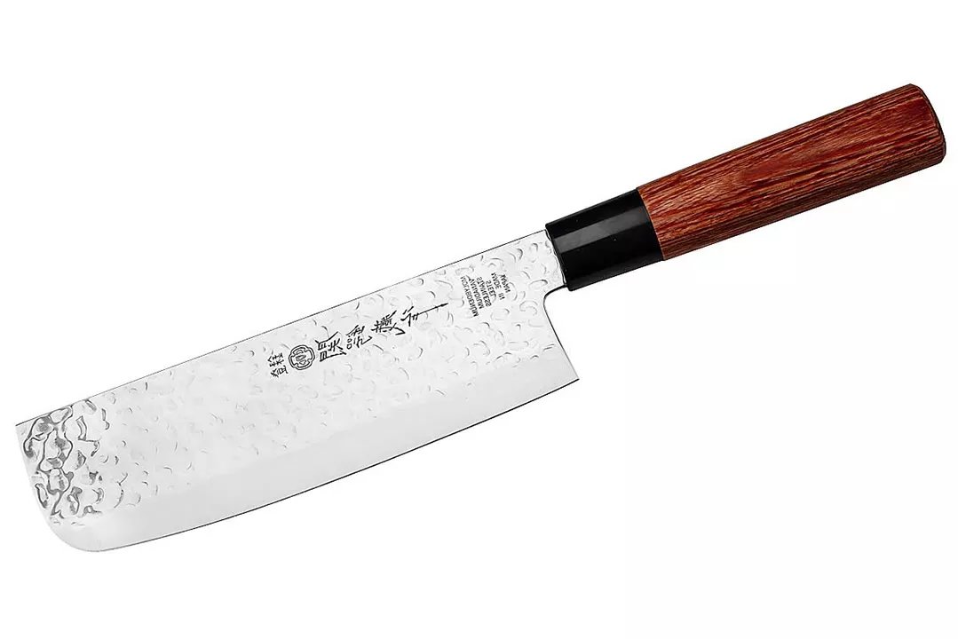 This Japanese Nakiri kitchen knife from Tsubazo features a double-sided ground blade made of stainless Daido 1K6 steel with a hammered finish. The handle made of pakkawood with a plastic ferrule fits perfectly in the hand of both right- and left-handed users thanks to its oval shape. The Nakiri is typically used for cutting and chopping fruits and vegetables. Not suitable for dishwasher use.
